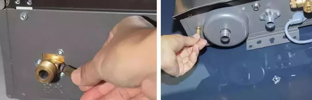 为避免排出积水沾湿周围环境,应使用容器盛排出的积水。燃气热水器不同机型进水处防水塞有以下3种结构。